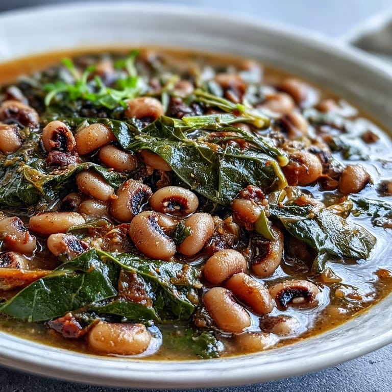Merken My grandmother used to say that black-eyed peas on New Years Day weren't just food—they were insurance against a lean year ahead. I never quite believed in the superstition until I made this dish for the first time on a cold January morning, the kitchen filling with the smell of smoked paprika and simmering broth, and suddenly the whole tradition made sense. There's something about combining tender peas with silky collard greens that feels like comfort distilled into a bowl. The first spoonful tasted like generations of Southern kitchens, and I understood why people return to this meal year after year.