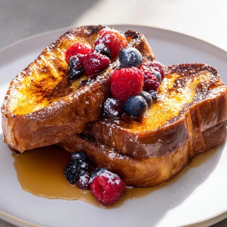 - Übertrage den fertigen Französischen Toast auf einen Teller oder ein Gitter. Wiederhole mit den restlichen Scheiben und teile die Butter nach Bedarf auf. Serviere warm mit Ahornsirup, frischen Beeren und Puderzucker.