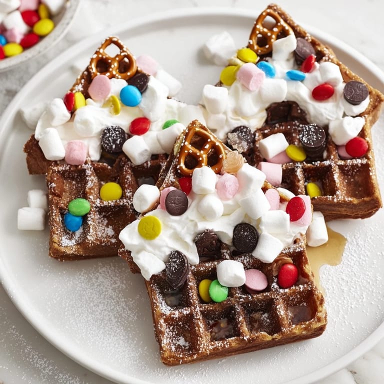- Waffeln auf einer Platte anrichten. Toppings und Dekorationen als Buffet bereitstellen, damit jeder sein eigenes Lebkuchenwaffelhaus bauen kann.