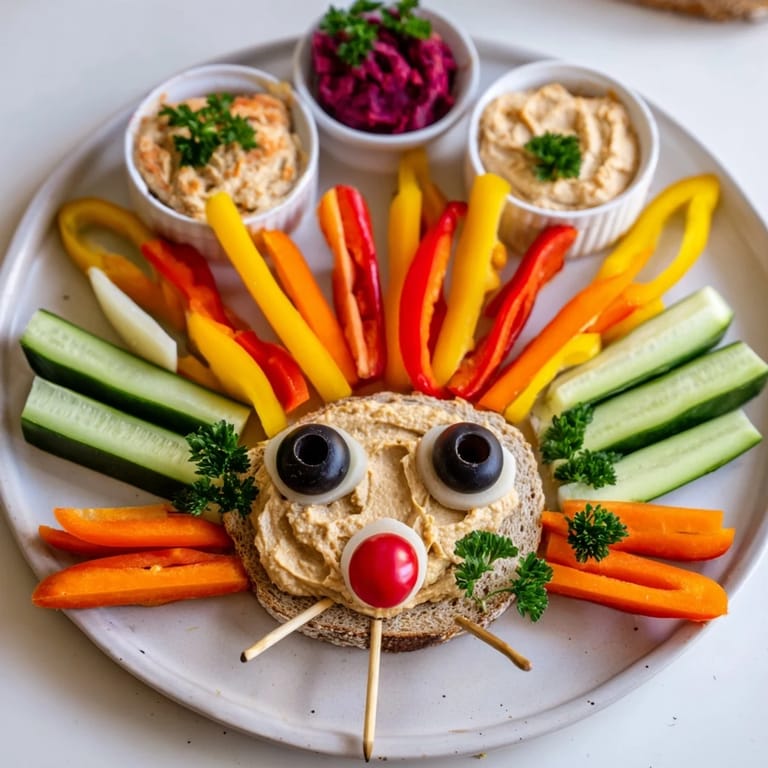 Merken Eine verspielte und elegante Herbstvorspeisenplatte mit einer Vielzahl von Dips und frischem Gemüse, kunstvoll arrangiert, um einen charmanten Igel zu ähneln – perfekt für festliche Zusammenkünfte.