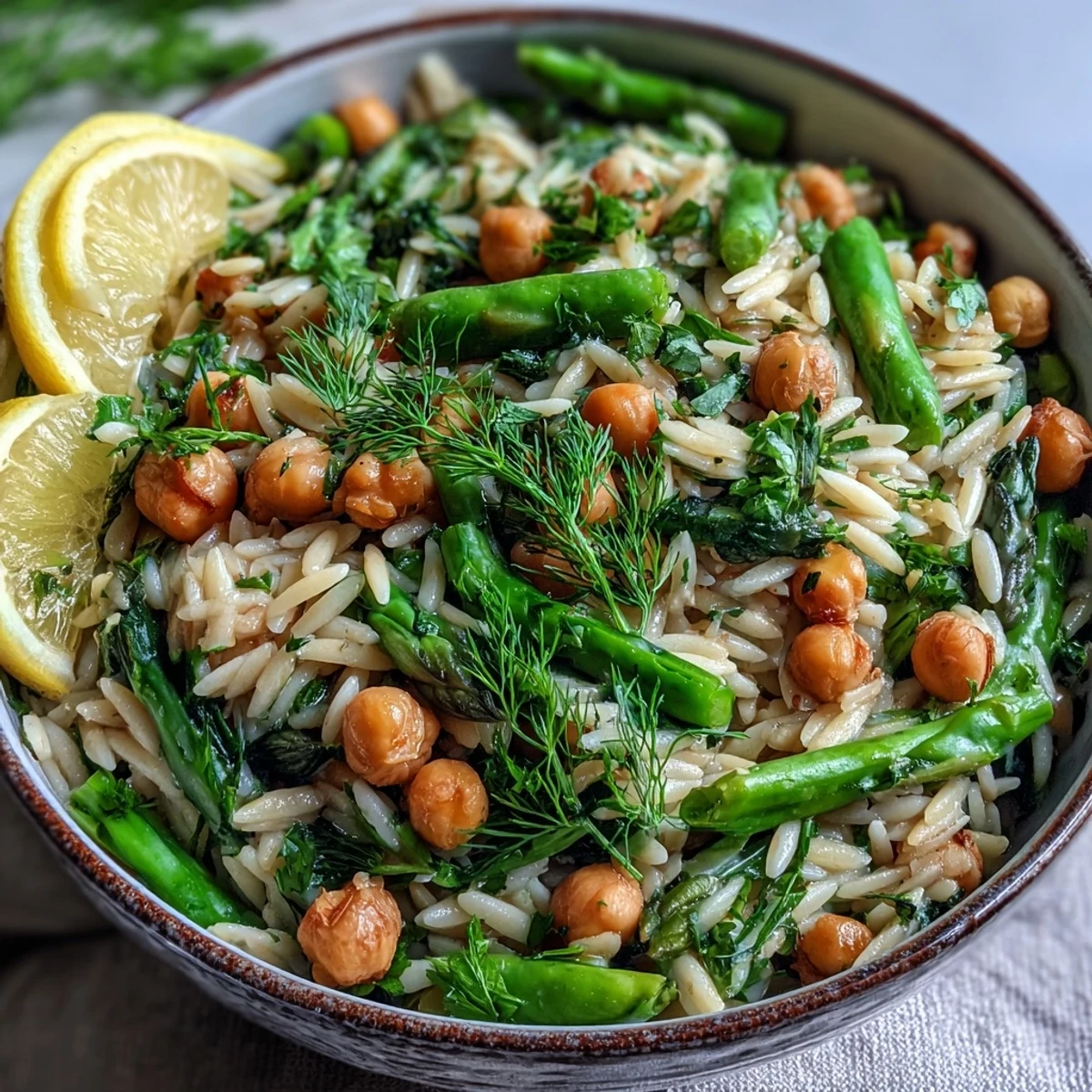 An afternoon when the farmers market had me standing between spring greens and fresh herbs, I grabbed handfuls of asparagus and dill without a real plan, just a feeling that something bright and lemony belonged in my kitchen that day. That impulse became this one-pot wonder—a meal that comes together in thirty minutes and somehow tastes like you've been tending to it all afternoon. The beauty of it is how the orzo soaks up all that herby, citrusy broth while the vegetables stay tender, not mushy, and the chickpeas add a quiet protein that makes the whole thing feel substantial without heavy. What started as market inspiration turned into my go-to dinner on nights when I want something fresh but genuinely easy.