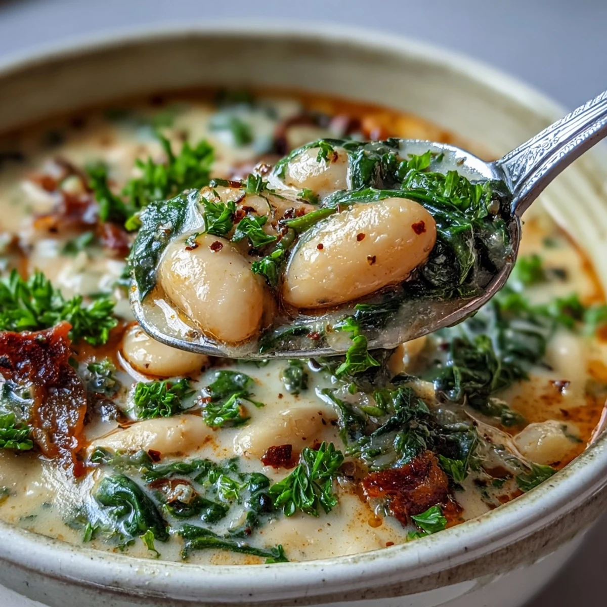 Merken An unexpected snowstorm caught me without much in the pantry, so I opened the cupboard and found two cans of beans staring back at me. That afternoon, I threw together what would become my go-to soup on days when the weather turns and I need something that tastes like it took hours but only requires thirty minutes of actual work. The smell of rosemary and thyme filling the kitchen while spinach wilts into the broth has become such a simple comfort that I find myself craving it even on the warmest days.