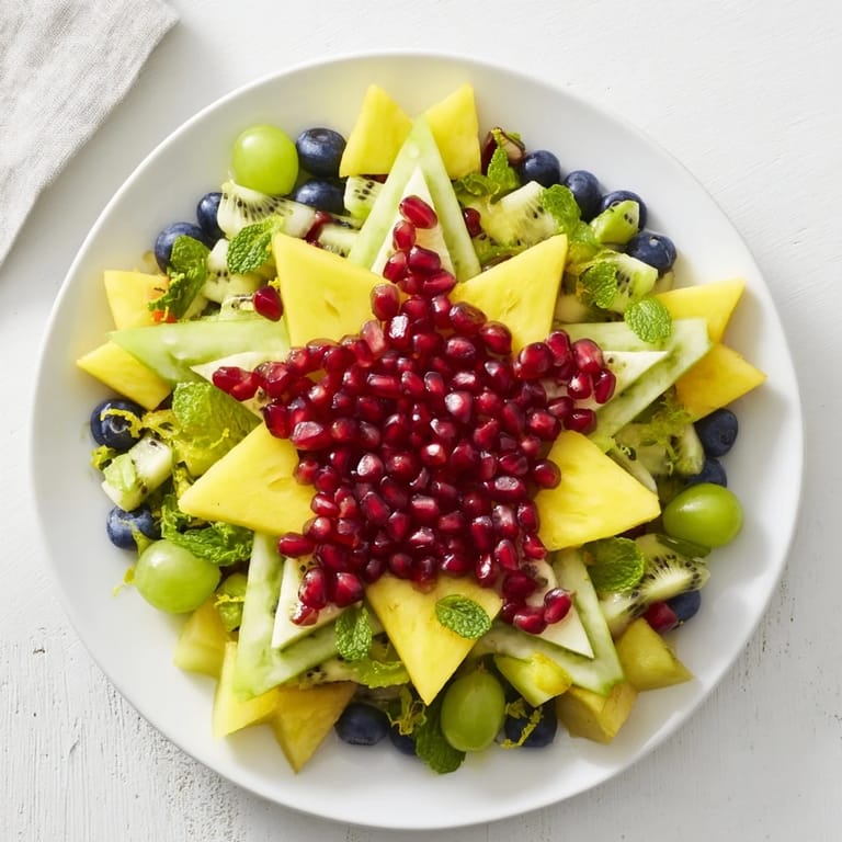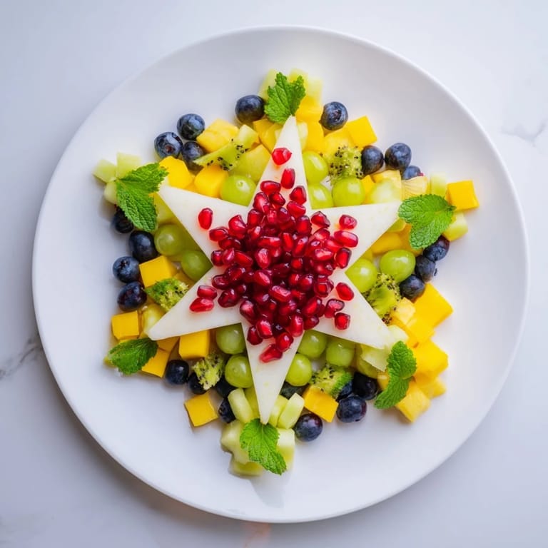 Merken Eine lebendige, erfrischende Obstplatte mit saftigen Granatapfelkernen und frischer Minze, kunstvoll in Form eines Sterns arrangiert – perfekt für elegante Brunches, Festtagstische oder gesunde Snacks.