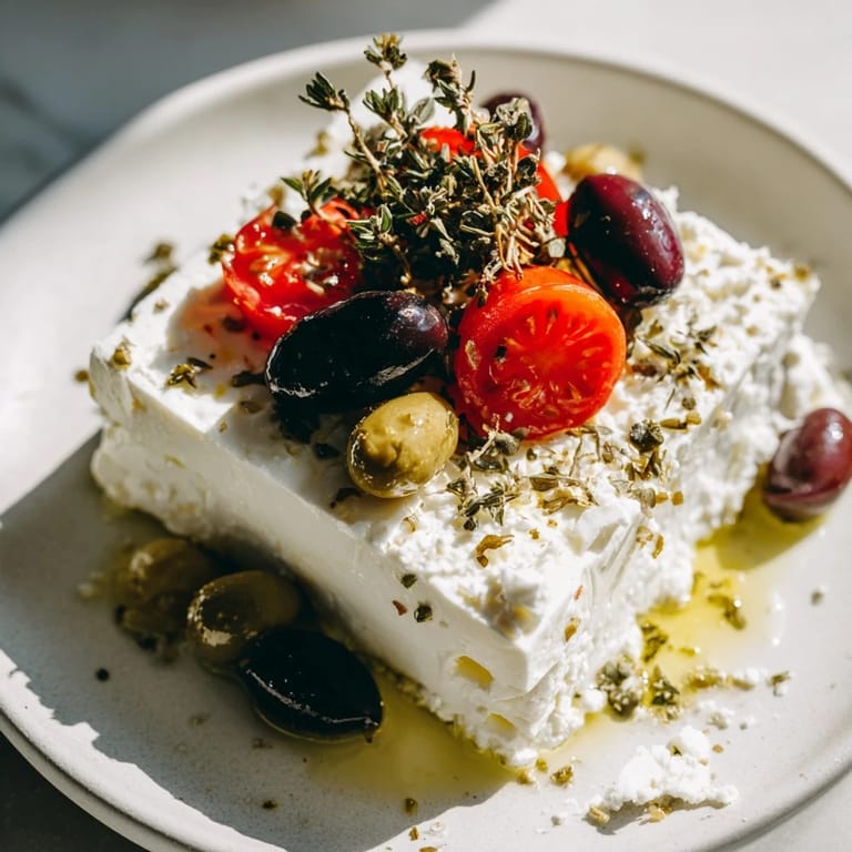 Merken Ein festlicher und lebendiger Vorspeise mit würzigem Feta, salzigen Oliven und saftigen Kirschtomaten, perfekt für Feiertagsfeiern und zwanglose Zusammenkünfte.