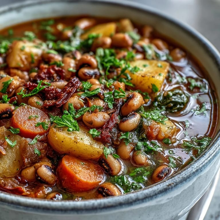 Nahrhafter Eintopf mit Schwarzaugenbohnen, Kartoffeln und Wurzelgemüse in aromatischer Tomatenbrühe.
