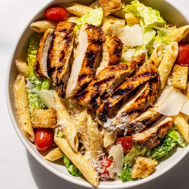 Merken An meinem Geburtstag wollte ich eigentlich nichts Aufwendiges kochen, aber dann stand mein Bruder in der Küche und meinte, er hätte Lust auf etwas mit Kick. Wir hatten Hühnchen, Pasta und eine Flasche Caesar-Dressing im Kühlschrank – also probierten wir einfach drauflos. Das Ergebnis war so gut, dass wir seitdem jedes Mal darüber reden, wenn wir zusammen essen. Diese Bowl hat die perfekte Balance aus cremig, würzig und frisch.
