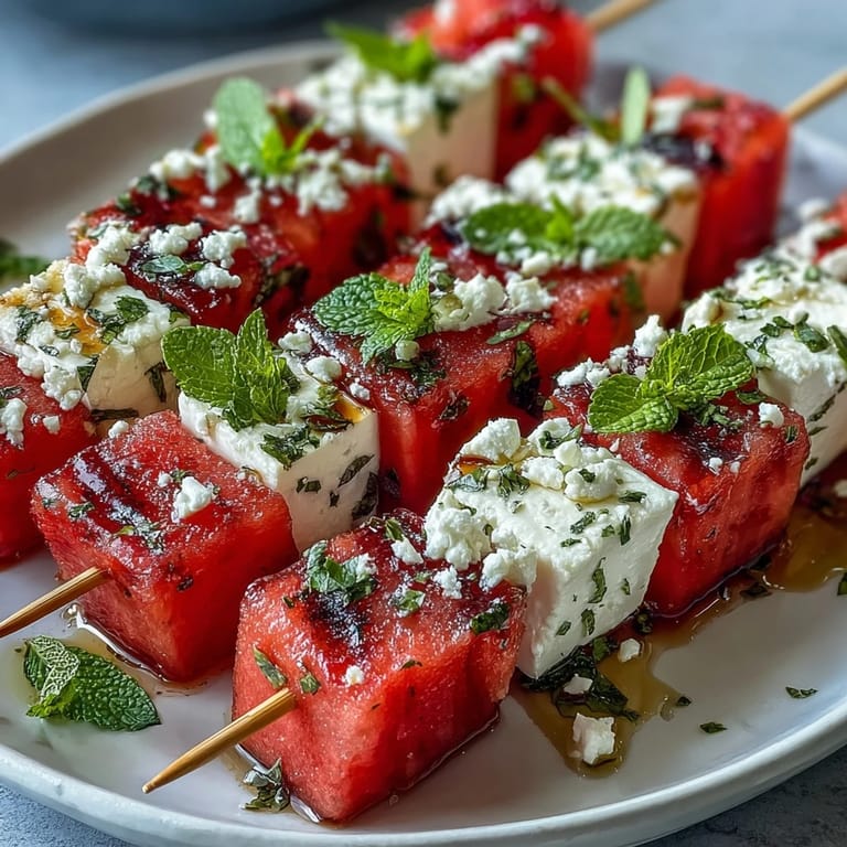Merken Last summer, I showed up to a friend's backyard gathering with these skewers, and they disappeared faster than the ice in anyone's drink. There's something about the way cold watermelon, salty feta, and a whisper of mint come together on a stick that makes people reach for another one without thinking twice. My friend Sarah asked for the recipe right then and there, standing in the shade with her bare feet in the grass. That's when I knew this wasn't just food—it was the kind of simple thing that becomes a summer tradition.
